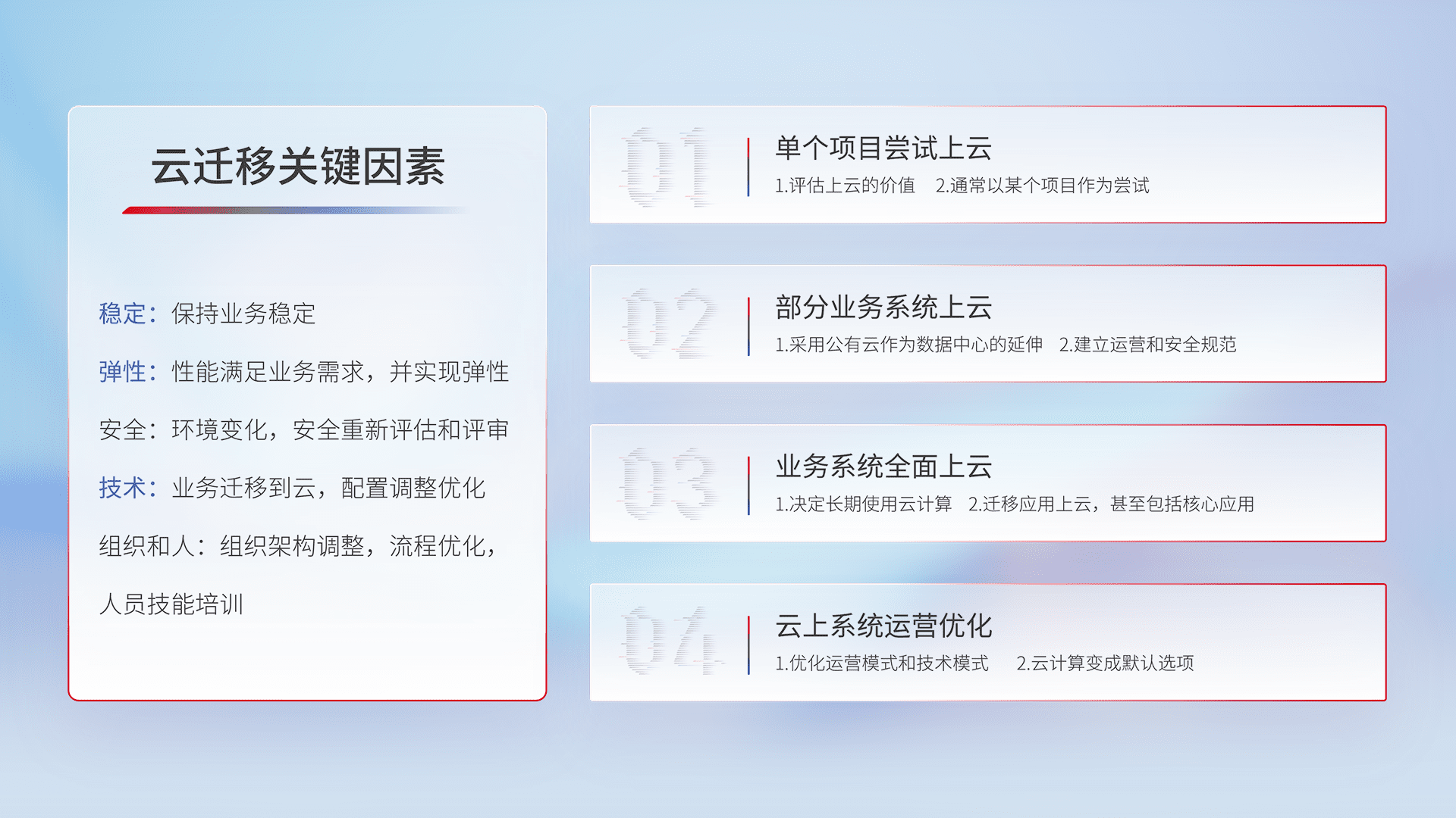 结合实际业务,,,从规划设计、、、、云平台选型、、云原生改造、、、数据迁移、、、、集成交付,,迁移全过程为客户识别最佳上云路径,,,,做好风险识别管理,,设计网络架构、、身份权限、、安全审计合规、、操作审计、、、、日志审计、、、、监控告警策略、、、、多站点容灾设计等,,,对云上基础设施进行整体规划,,提升IT治理水平,,,,以满足弹性、、高可用、、、、高性能的需求。。。