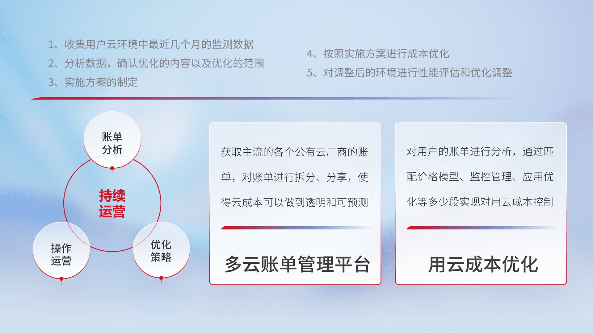 通过多云纳管,,,,以统一的资源数据模型把客户的云资源进行抽象和封装,,,,进而实现对多云资源的统一操作,,保障云资源管理的可靠性、、、、稳定性与可用性。。。。量身定制化运维内容,,,,配置、、、、开发运维、、补丁管理、、、备份、、监控、、、、认证和访问管理、、、、审计和日常巡检等,,,保障在用云过程中的可靠度,,稳定度以及高可用率。。